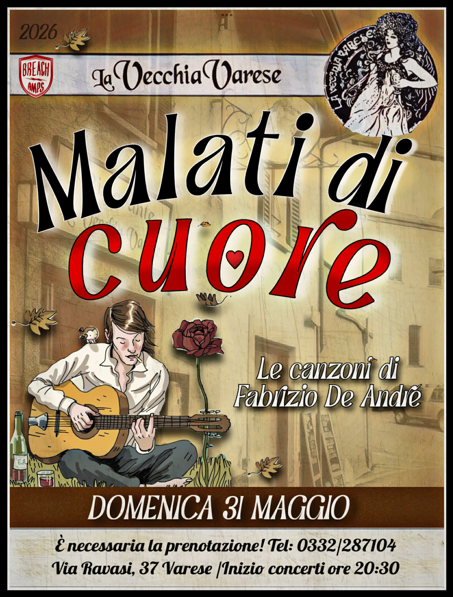 Malati di Cuore 31.5.26 22/04/2026Concerti Voce, chitarra e flauto per rivivere le emozionanti canzoni di uno dei più importanti cantautori italiani.